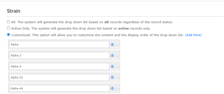 Select the dropdown category you would like to manage from the dropdown list. Selecting Active Only will show only active records with that field assignment. Once selected, the dropdown option will appear below.
